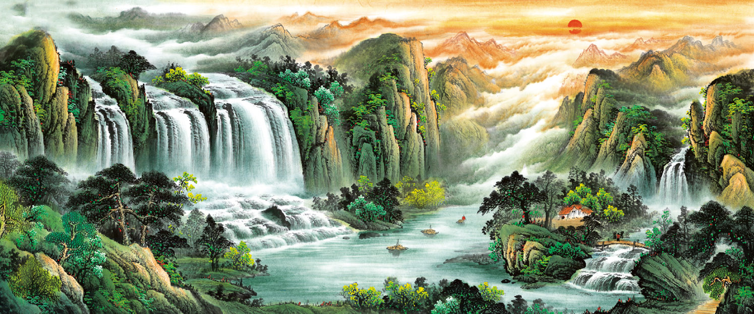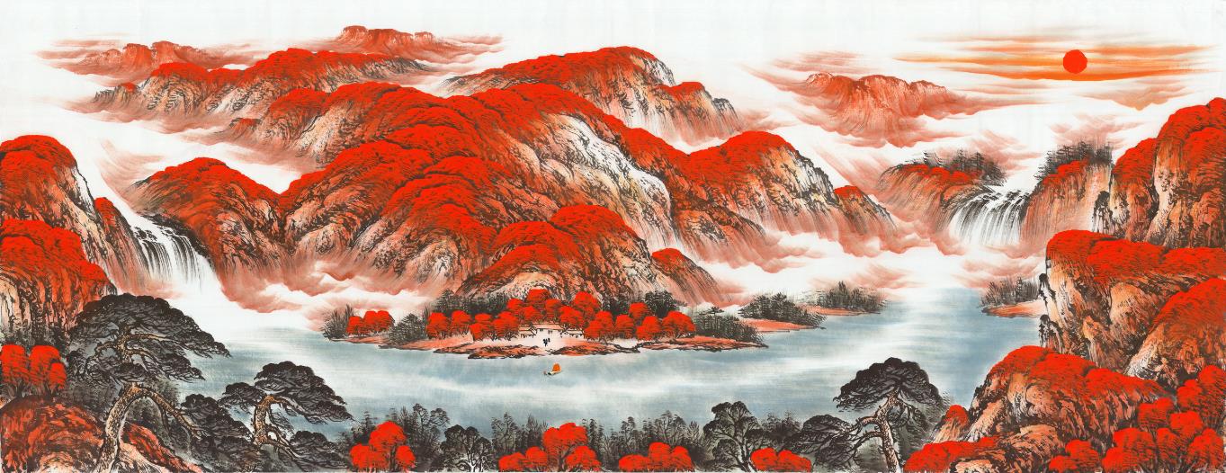 而他作画的画风非常有特点,山水画古风与现代风格结合为一体,犹其是红色山水画,与李可染的红色山水画一脉相承,又结合了当代的审美,多以大瀑布气势澎湃,山高石险,小桥流水,福居雅地,一帆风顺等题材寓意着生活的美好。