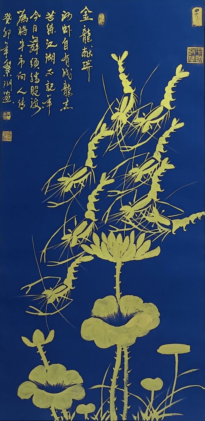 《和和美美-五米长卷》2000年与欧阳中石参加两岸艺术交流会入展作品;载入《世界当代华人艺术家史册》成为首位携金墨虾走出国门的艺术家。2020年业界估价600万起。