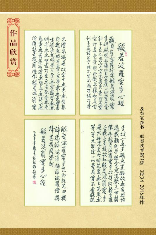 现专门从事双笔书法。六岁在其父指导下临摹柳公权等名家字帖,十岁左手练字。一直以"信(念)、勤(奋)、悟(性)、韧(劲)、博(学)"五个字为座右铭,取得双脑齐慧,双笔无佳的收获。可让人任意报字点词,左右笔同时书写诗词和对联。不仅能同时顺书,也能同时倒书,还能顺倒齐书,并均能双正、双反、一正一反,是罕见的全方位双笔书法家,人称当代"神双笔"。过硬的左右笔书法功底和神奇的双笔绝技,蜚声海内外。近几年,应邀在北京、沈阳、长春、哈尔滨、蚌埠、无锡等地表演三百余场(次),均有轰动效应。40余次在国际国内获奖,其中二等奖以上达十次,在国内外展出和被单位、个人收藏的作品已超千幅。全国已有中央人民广播电台、《当代中国》画报、《中国地名》杂志等百余家新闻单位对他作了报道。其业绩与佳作已载入《世界名人录》、《世界华人文学艺术界名人录》等40余部辞书,并获"国际书画艺术名人"、"当代艺术成就家"等称号。