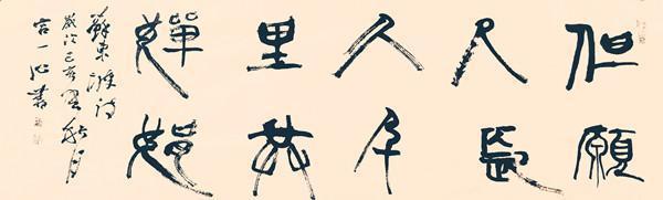 宫一心书法,重在用笔,用墨,其表现在笔力雄奇,气场圆通,其书厚重苍劲有力,大气,古朴,行气自然,宽厚圆融。