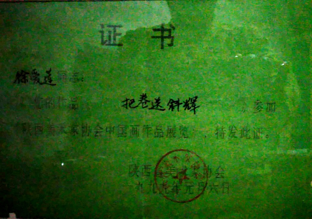 徐老师在陕西省美术家协会荣誉获得,一九九九年美展参展证书《把卷送钭辉》