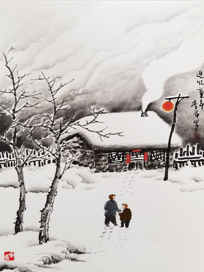 读他的冰雪山水画,使人有一种心清气爽的感觉,由目光所及,渐而涌入心间,从而在脑海里浮现出高山止仰的“空明之境”。在她的画卷中,山与水、石与木、林与泉,相互交融,以“至简”的勾勒,呈现出精美娟秀的冰雪世界。其冰雪之白,白的纯真,白的典雅,在山水之间,藏匿柔情似水,赋能画卷山之雄浑、冰之气韵、雪之涵养、水之灵秀。