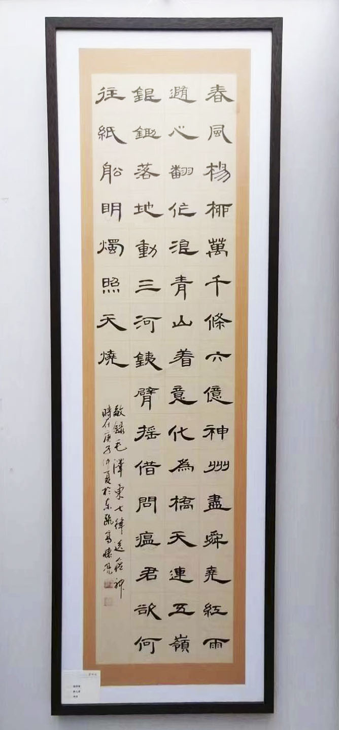 高老师具有丰富的书法教学培训经验,历经四十余载的书法研究创作,主攻隶书,潜心翰墨,笔耕不辍,具有个人独特的艺术风格。观其隶书作品,极有帛书隶的风度,也有碑刻隶的风骨,可作刚柔相济的典范。左掠之,右挑之,一波必三折而过,一竖常隐锋而成。正是精心琢磨曹全碑的大有收获。高老师博学多识,儒雅君子,修成地地道道的文人品质,所以习成书法就有书如其人的核心。起笔落笔可以写出金书锦字,一展锋毫可以传承书法文化正宗龙脉。在他的书法世界里游目骋怀,文人书法,道法自然!